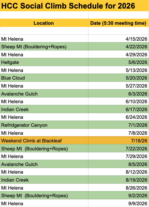 To connect members of our local community the HCC facilitates weekly meetups at local Helena crags. Note: no instruction or gear are provided.